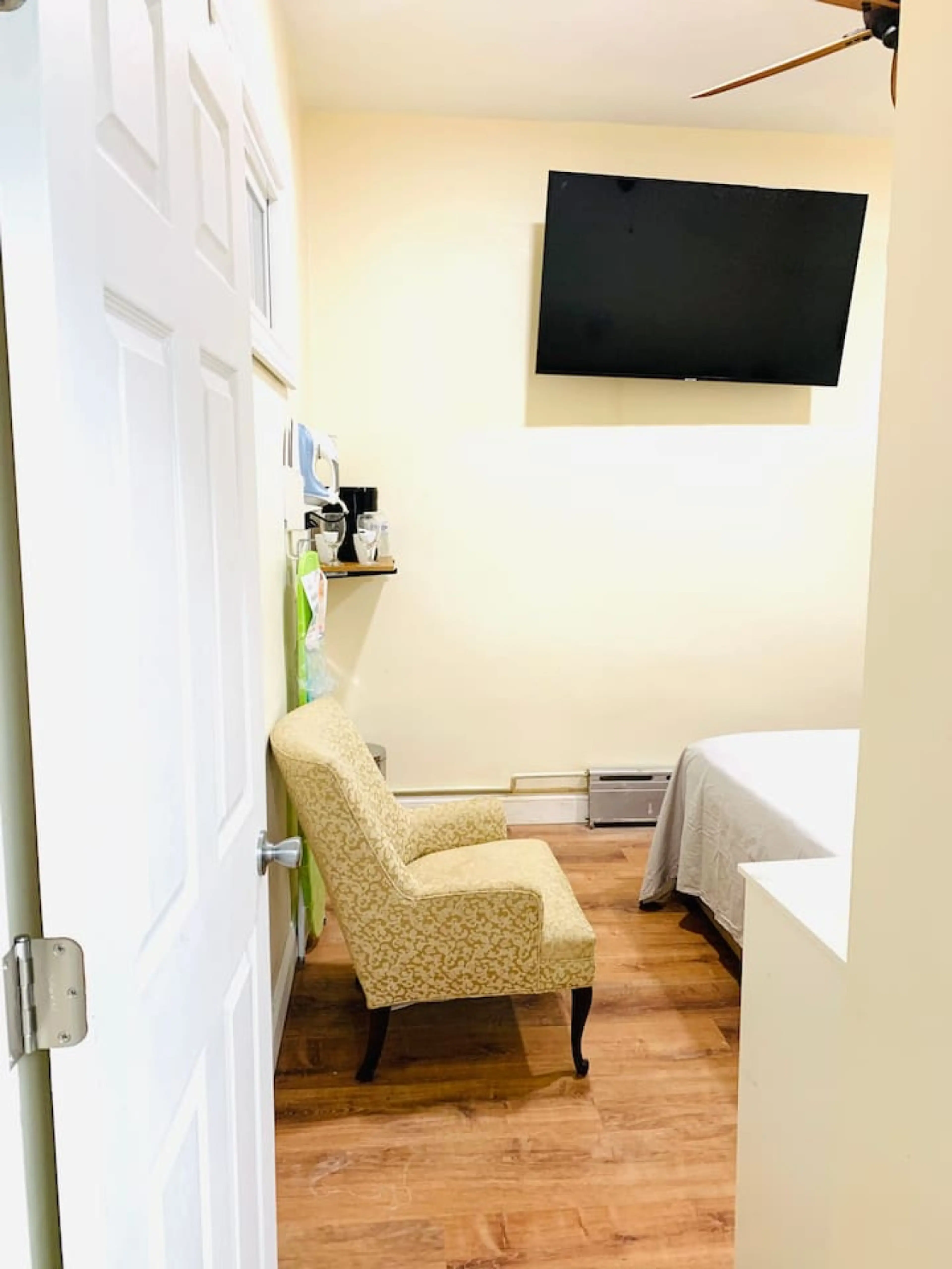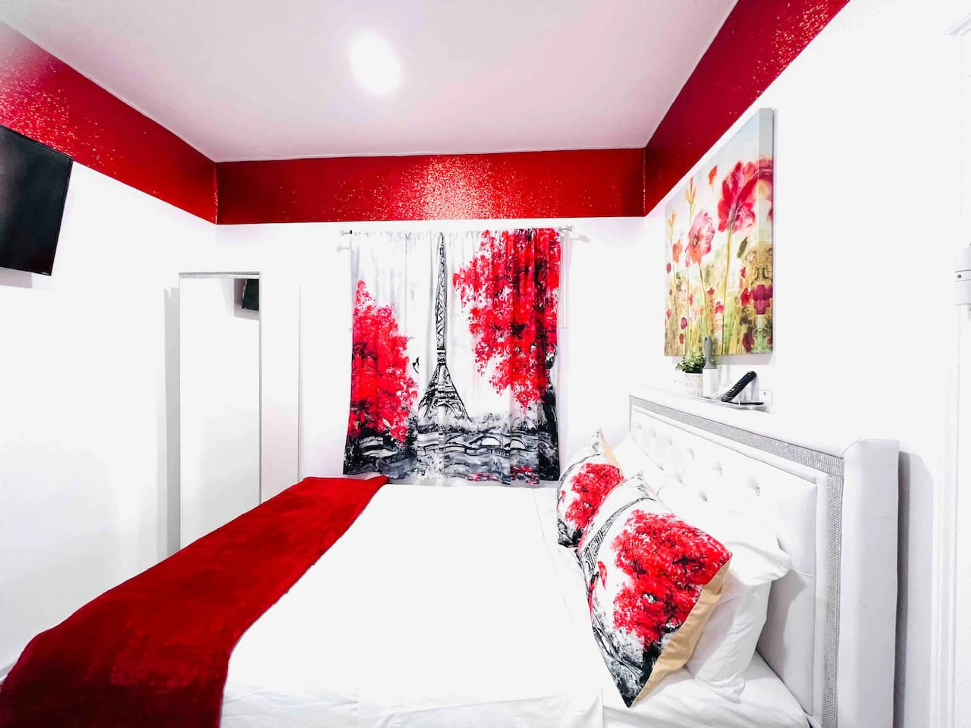 Come relax in the Hello Paris room. Decorated with Paris theme accents. ❤️HELLO PARIS❤️ room is equipped with a mirrored wardrobe, microwave, mini fridge, work desk, chair, cleaned white sheets, a queen size bed, TV, trash can, Paris wall art decors, and clean bath towels. Your room is steamed cle...